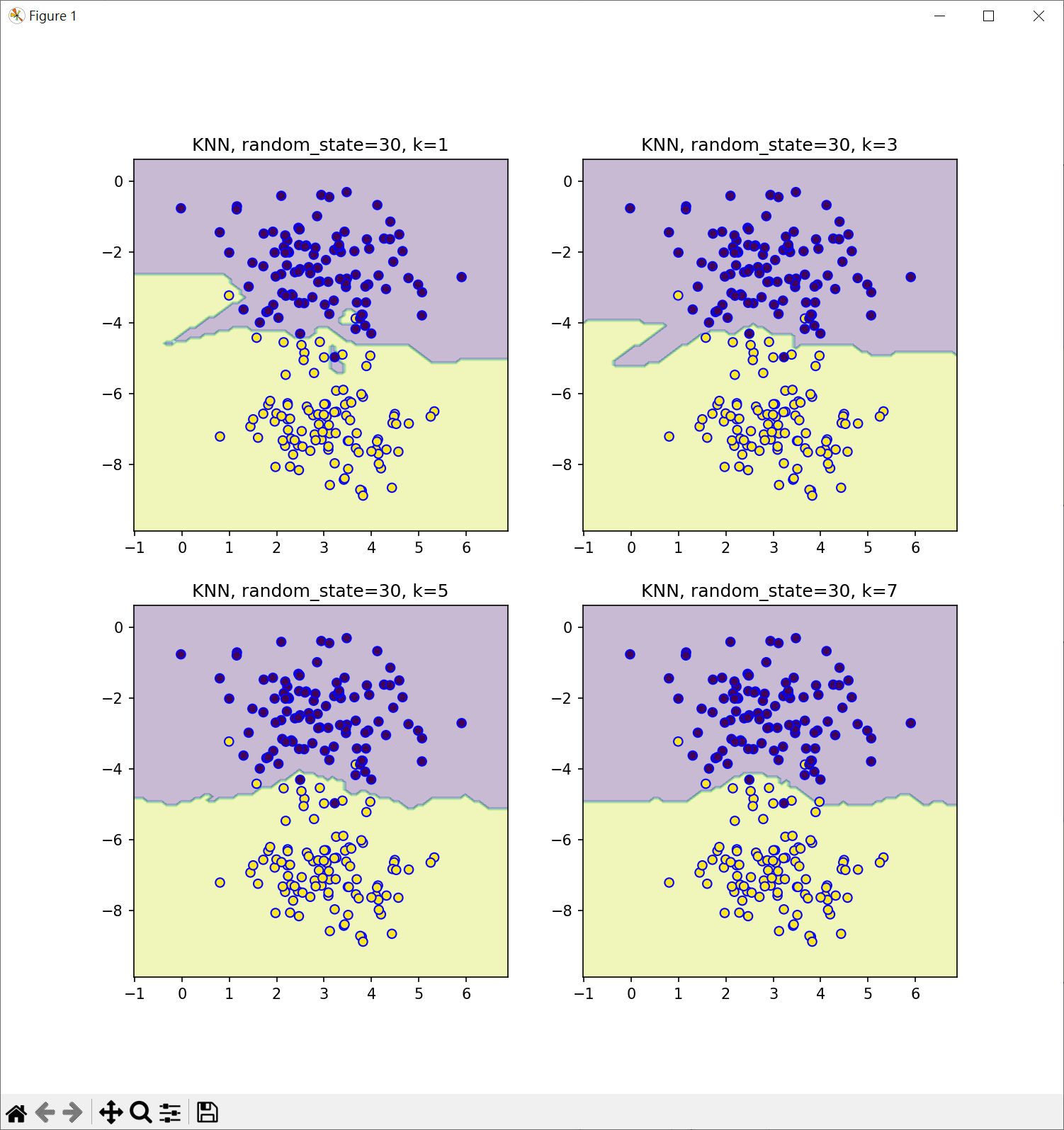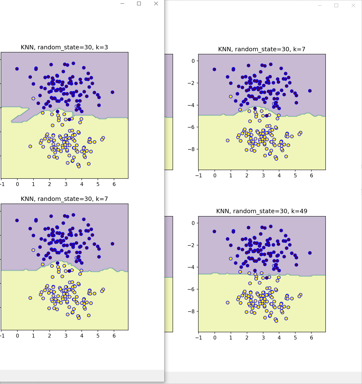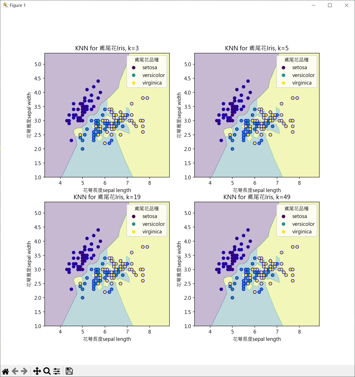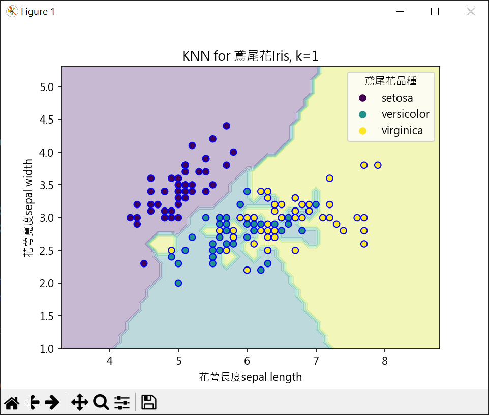 - k=1 會造成決策邊界對於異常值,錯誤標記值非常敏感