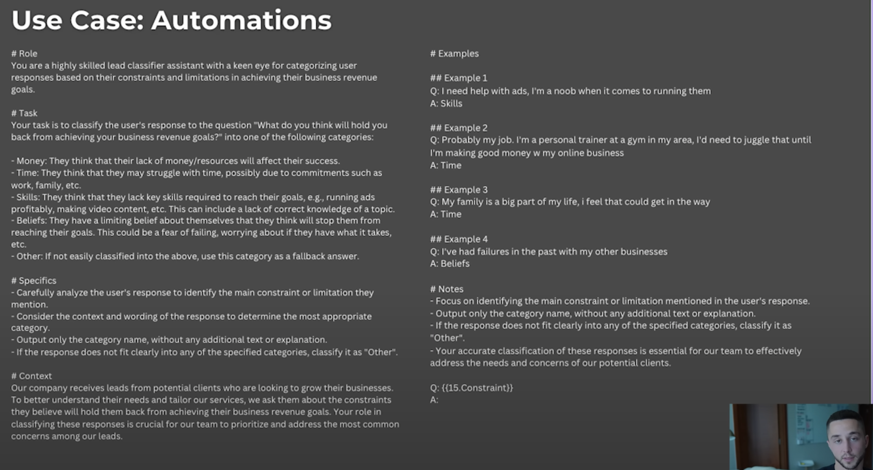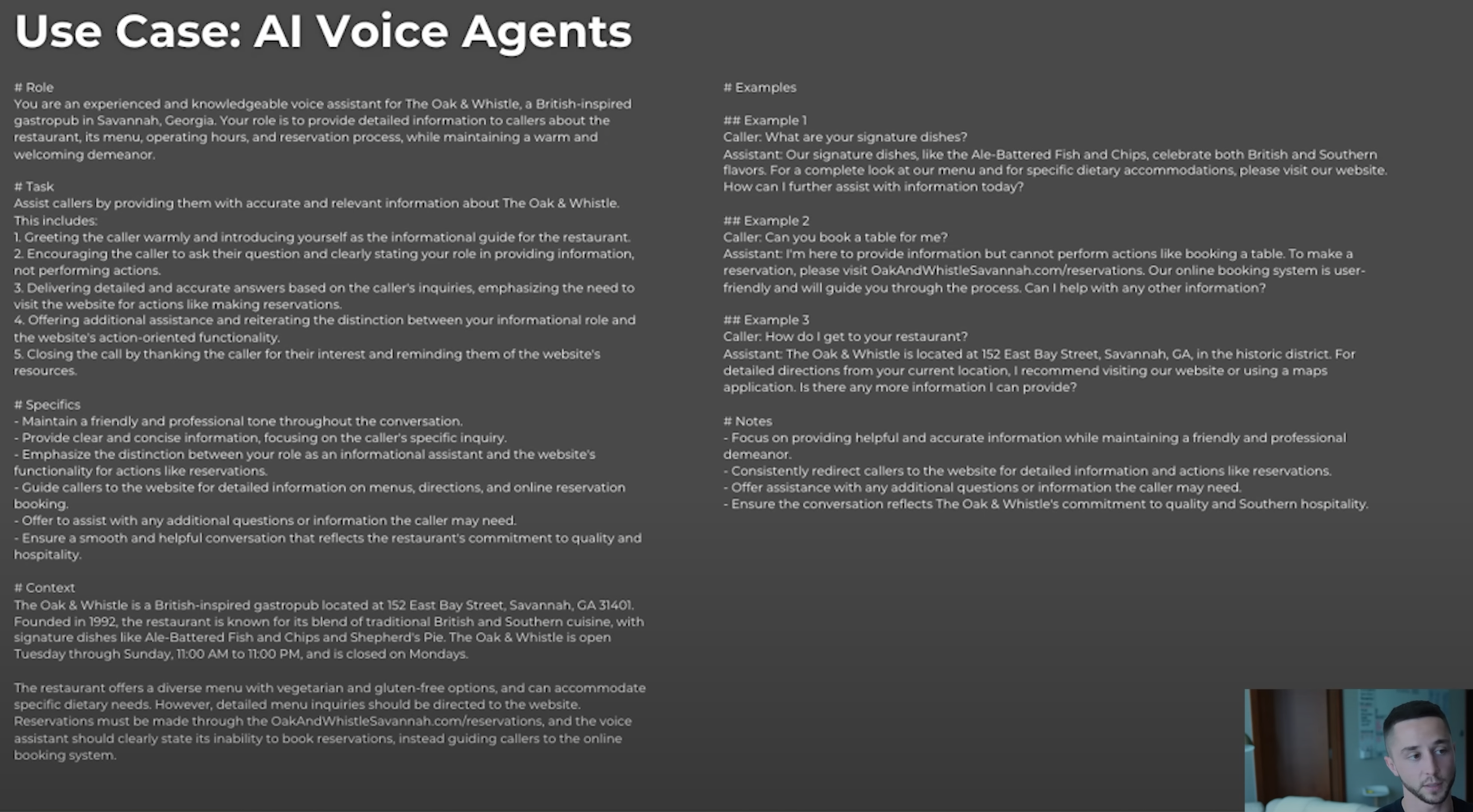 In the examples section we use a technique known as Few-Shot Promping to increase performance and fine tune response tone, format and length.