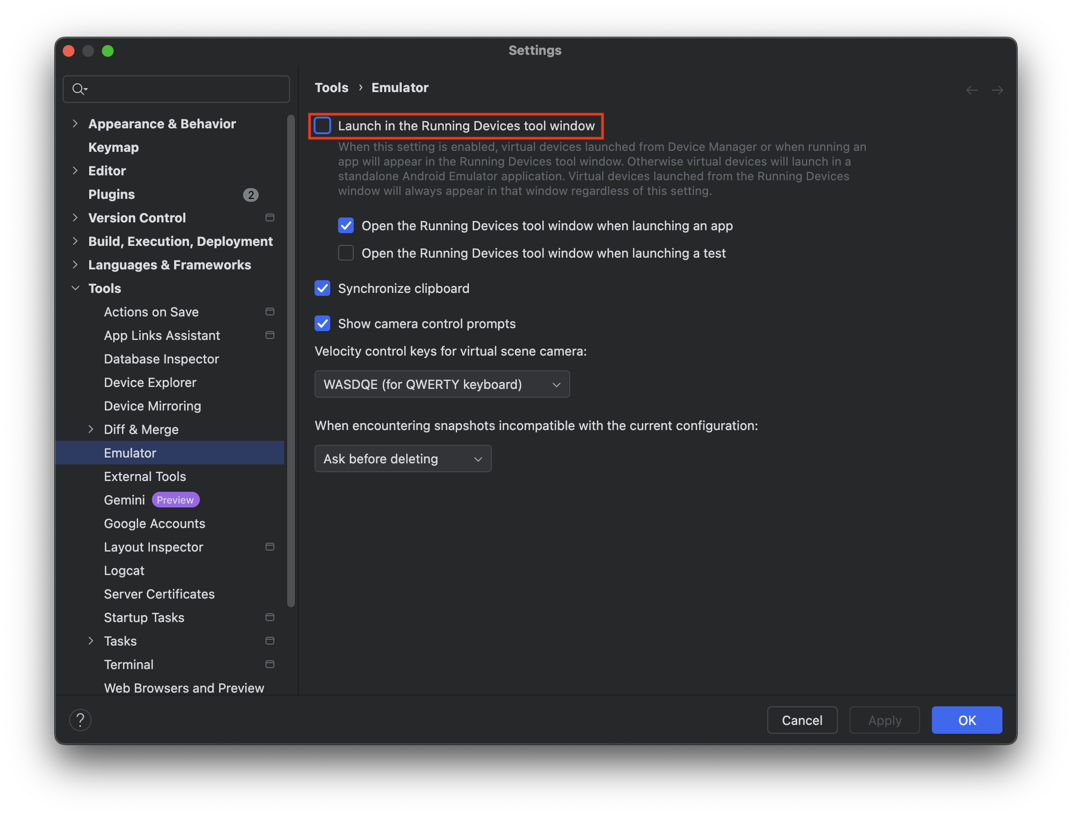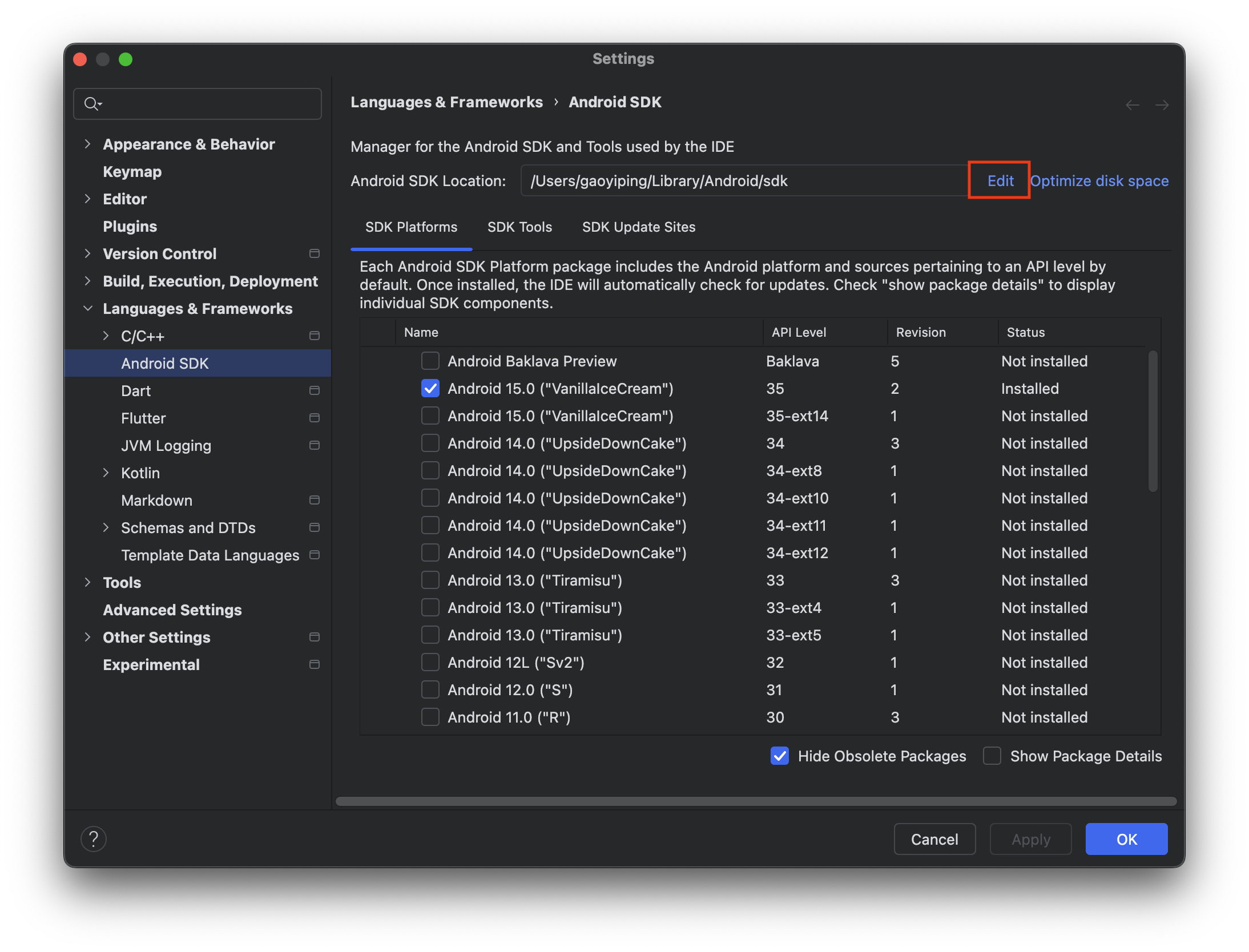 flutter doctor [!] Android toolchain - develop for Android devices (Android SDK version 35.0.0) ✗ cmdline-tools component is missing Run `path/to/sdkmanager --install "cmdline-tools;latest"` See https://developer.android.com/studio/command-line for more details. ✗ Android license status unknown. Run `flutter doctor --android-licenses` to accept the SDK licenses. See https://flutter.dev/to/macos-android-setup for more details. # 缺少 cmdline-tools: cmdline-tools 組件缺失,需要安裝。你可以執行以下命令來安裝它: # # install by Android Studio # Android Studio -> Tools -> SDK manager -> SDK Tools -> Android SDK Command-line Tool(latest)